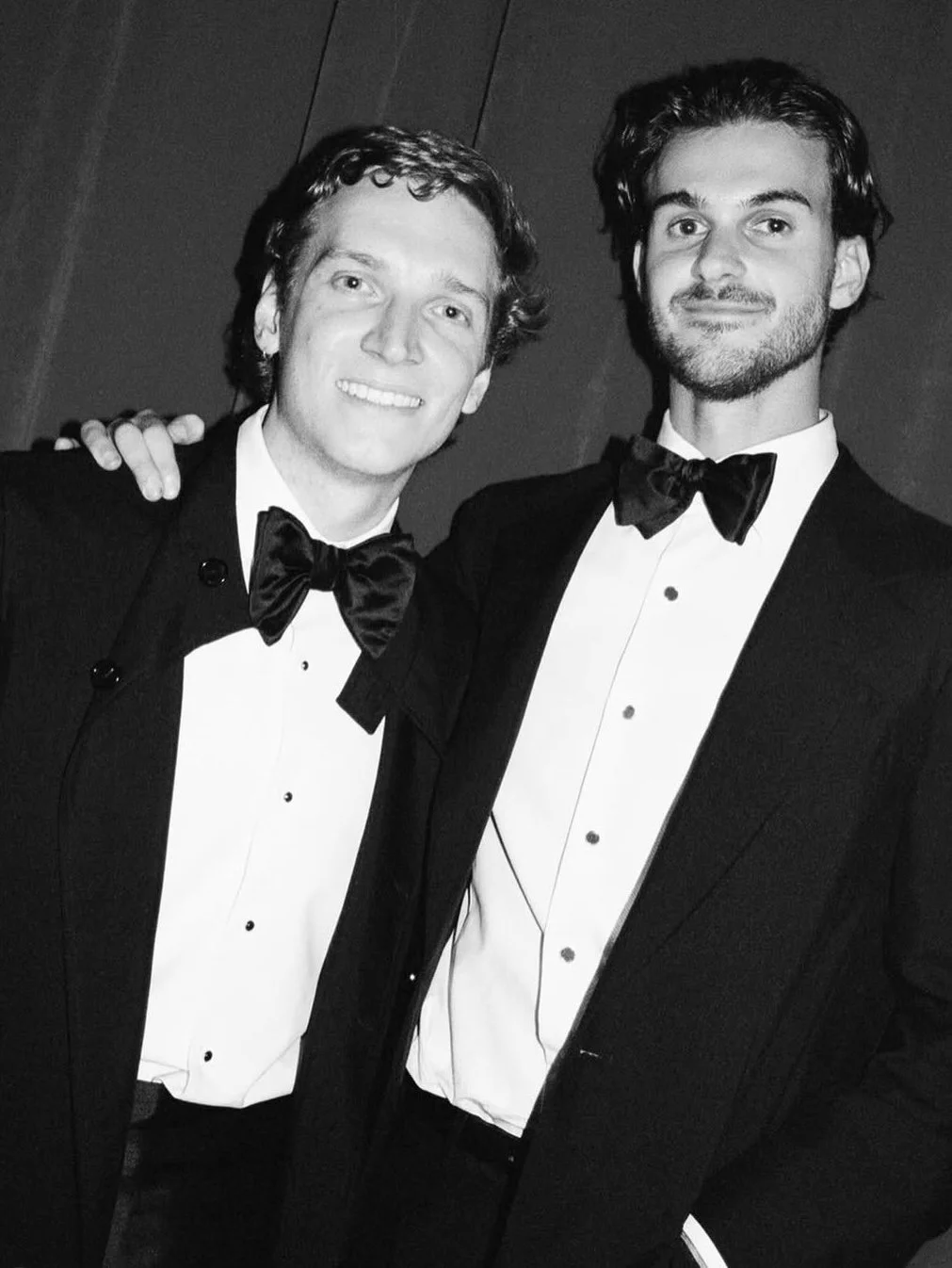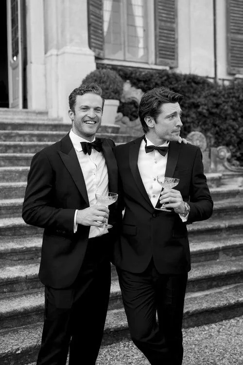 For men: a black tuxedo or dark/black suit. Think bow-ties over ties. Clean, tailored, intentional.